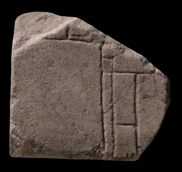 | Description The fragment was the corner of a slab. A large enclosure occupies most of the bottom left corner of the fragment. It is flanked on the right and on top by three narrow, elongated spaces, one of which (top right) seems to be recessed. N.B. A horizontal line at top, delineating one of these narrow spaces, is missing in AG 1980, pl. 44. Other rectangular spaces are placed behind these narrow areas.