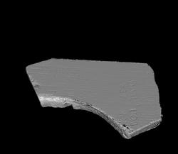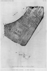 | Description This large piece touched three sides of a slab. Two complete and two partial clampholes are visible, as is a partial tassello on the back. The fragment depicts portions of four or five separate building complexes, divided by three streets or alleys. A wide open space flank these buildings on the right. Across the bottommost complex is inscribed HORREA LOLLIANA. A mistake is evident in the inscription after the second L; perhaps the engraver thought better of starting a new letter there. This complex is divided into two distinct but connected areas, each consisting of rows of fairly uniform rooms suggesting storage flanking a large courtyard. Access is controlled between the two courtyards by means of a long passageway. A staircase is represented by a triangle in the lower lefthand corner of the complex. According to Pedroni 1992, the three crossbars in the triangle indicate that the stairs gave access to three storeys. On the righthand side of the building is depicted a wide platform, perhaps for unloading of goods, with two sets of staircases leading down to the open space. Other interesting features include possible guardrooms along the bottom of the complex and a set of very long and narrow passageways along the bottom of the lefthand courtyard.