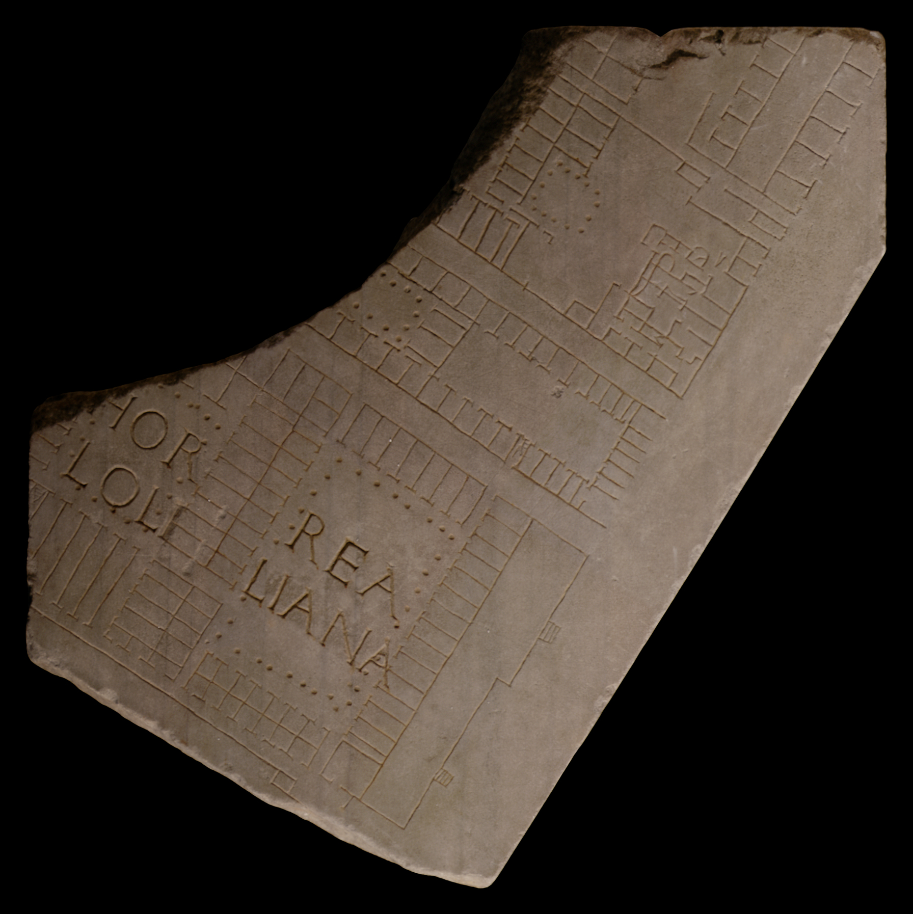 The Horrea Lolliana represent the only labeled horrea complex that the Marble Plan provides. Given the date of the Marble Plan, we have to assume that this representation of the horrea Lolliana reflects the particular needs of the city with regards to grain/food distribution at the beginning of the third century CE. The location of this complex on prime riverfront property, the buildings relative compartmentalization and high, albeit controlled, amount of access when compared with horrea from Ostia, all suggest that in spite of the label horrea (which normally indicates a storage facility), this structure was used for the checking, sorting, short-term storage, and distribution around the city of goods unloaded from riverboats. The obvious comparison is with the Porticus Aemilia (FUR frs. 23, 24b, and 24c).