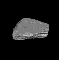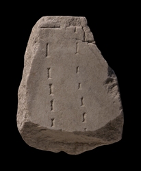 | Description The fragment was part of a slab edge. Two vertical and parallel dashed lines traverse the fragment. Just before they reach the top edge, they encounter a perpendicular line of wide dashes. N.B. The rightmost horizontal dash is not visible in AG 1980, pl. 44. The topmost dash is missing from the left vertical line; is this a mistake by the engraver, or does it actually represent a gap in the sequence of dashes, i.e. an opening in the arcade at this point? Open space flanks the dashed lines on both sides.