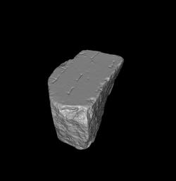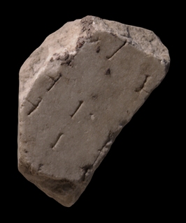 | Description The fragment was part of a slab edge. An irregularly drawn arcade curves gently towards the upper right. It is flanked on the left by what seems to be shop fronts; these follow the same curve as the arcade. On the right, another line of dashes, perhaps T-shaped piers or shop fronts, flanks the central arcade; this line also follows the curve of the arcade in center.