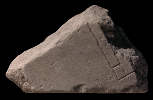 | Description The fragment was part of a slab edge; a clamp hole is visible on the back. The piece is mainly blank; a corner of a building is visible on the far right. It is lined on the left by a long, narrow space that has been divided into a short and a long section, the short section being in the corner of the building.