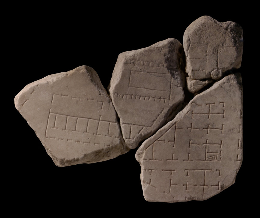 | Description Frs. c and d were part of the edge of a slab; a clamp hole is visible at the bottom of fr. d. The architecture depicted on this fragment is divided into sections of rhomboidal and trapezoidal shapes. To the far left, a short section of an arcade is visible. It lies at an oblique angle to the structure to its right, which consists of a long, horizontal row of tabernae. The entire stretch of shops is fronted by an arcade. The right side of this stretch of shops is cut off at an oblique angle, more or less parallel to the arcade in the far left side of fr. a. The left half of the shops shares the back wall with a rectagular enclosure, whose other three walls consist of arcades. A diagonal arcade continues the angle of the right end of the shops and connects with a structure that occupies most of fr. b. This structure consists of a rectangle that is flanked at the back by a straight, solid wall, on the right by a row of square columns, and on the left by a line intersected by short, perpendicular strokes. A passageway, following almost precisely the break line between frs. b and c, then b and d, separates these two structures from the three blocks or insulae that occupy the right side of the fragment group. At top right lies a group of rooms, best visible in the reconstruction drawing in PM 1960, p. 131, most of which do not seem to open onto the street. Below is situated an almost triangular section of rooms. Its left side falls at an oblique angle that follows the break between frs. b and d, and the angle of the right end of the horizontal row of shops on the left. The rooms inside this section are rectilinear and they all have at least two openings. A staircase in the bottom right room indicates that the building was multi-storeyed. This section is separated from the triangular section below by a narrow, horizontal street. Also this section consists of rectilinear, open rooms. The horizontal street that separates the top section from the middle section makes a right turn and it flanks the middle and the bottom section on the right. The face of other buildings, or perhaps a vertical arcade, is barely visible in the right edge of the fragment group.