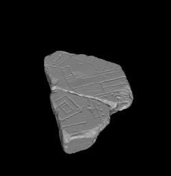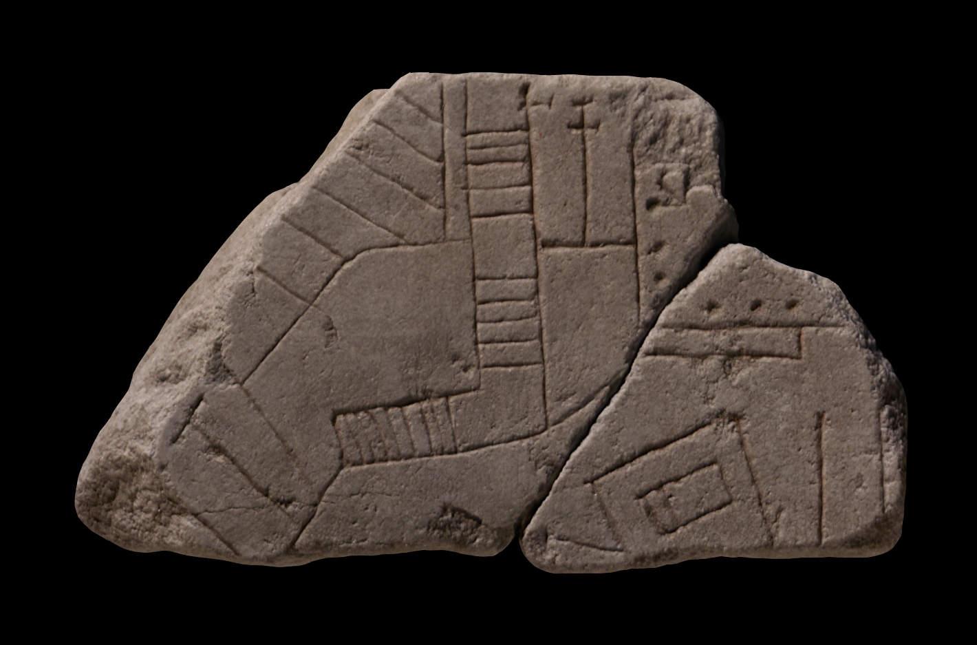 | Description The fragments have slab edges along top and right sides. There is a clamp hole along the top edge. Some red paint survives in the incisions. The architecture depicted represents a ramp with stairs that makes its way vertically from the top of fr. a, then on fragment b makes a sharp right turn and ends abruptly. To the left of the ramp lies an open space framed by a C-shaped row of elongated rooms. No doors seem to connect these rooms to the open space. Adjacent to the right side of the ramp are two, perhaps three more rooms. At top right, the lower left corner of a colonnaded courtyard is visible. In the bottom right corner, a rectangular feature encloses a smaller structure.
