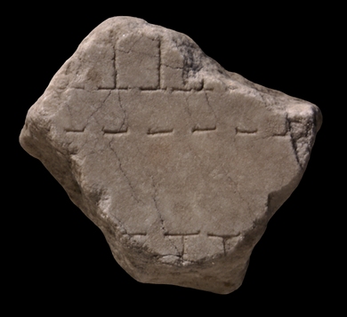 Identification Rodríguez-Almeida has suggested that the marble type and color of this fragment, plus the ductus of the carvings, make it likely that it belongs in slab VII-14 (AG 1980, p. 160). The rooms depicted in this fragment are probably tabernae, ubiquitous on the Plan. The luxury of having a covered sidewalk or portico in front of a row of shops was apparently not restricted to such grandiose areas as the slopes of the Palatine, facing the Circus Maximus (see fr. 8bde). Frs. 33abc, 34a, 34b and 34c depict a large, predominantly commercial area by the Tiber which abounds with rows of tabernae and arcades. This fragment might belong to either such areas. These covered arcades or porticoes signify that there was a second storey or a mezzanine level above the shops, which would have provided the shop owners with additional living room (Reynolds 1996, p. 158).