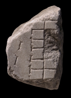 | Description The entire right side of the fragment is occupied by a vertical row of tabernae, facing towards the left. It may be back to back with another row of shops. On the left, the shops are faced with an arcade that is not, however, completely parallel to the tabernae but approaches it at an oblique angle.