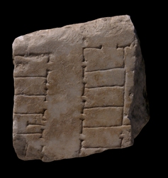 | Description A vertical street separates two vertical rows of rooms. All rooms face the central street. The top and bottom rooms on the right have additional openings in the side and in the back. A guide line is visible in the top opening of the room at the top. The entry to the second room from the bottom on the left is divided by a short wall and two very vague cross walls. Do these represent stairs?