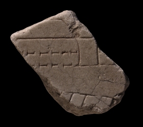 | Description A horizontal line traverses the fragment at the top. Below, and parallel to this line, lies a double arcade. Strangely, the dashes of the individual arcades do not align. On the right, the end of the arcades is marked by a rectangle whose left side is concave. The curve of the rectangle seems to continue to the top of the fragment. The rectangle itself connects with the horizontal line at top. At the bottom of the fragment, a row of rooms or T-shaped piers makes a gentle downward curve towards the right. An open space or passageway separates these from the arcades above.