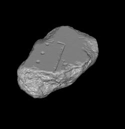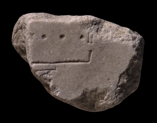 | Description The fragment was part of a slab edge. Top left, the corner of a building is visible. In its short side on the right, a narrow opening is situated close to the corner. This opening is flanked at top by a double line - perhaps a step? Inside the building, a horizontal row of columns reaches all the way to the presumed steps in front. Below, the corner of another building is barely visible. It seems to contain a staircase (PM 1960, p. 133).