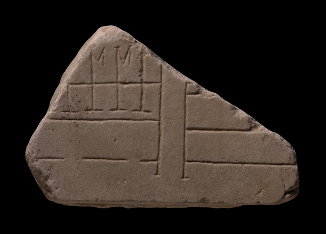| Description A series of straight, parallel lines traverse the fragment. They are cut through at the center by a wide, perpendicular passageway. On either side of the passageway, only the bottom lines align with each other. The bottom left line consists of long dashes as opposed to a solid line. On the left, a row of rooms is placed between the first and second horizontal lines from the top. The rooms face downwards. Right above them lies another series of rooms; these all contain a staircase.