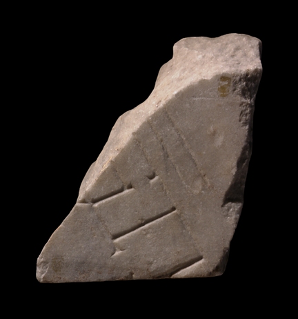 | Description The fragment was part of a slab edge. A series of three or four rooms share a common back wall on the right. One room is completely open to the left; the room above it is entirely closed except for a small opening into the fourth room at the top. To the right of the common back wall, and parallel to it, lie to parallel lines that end abruptly in mid-space. One is slightly longer than the other.