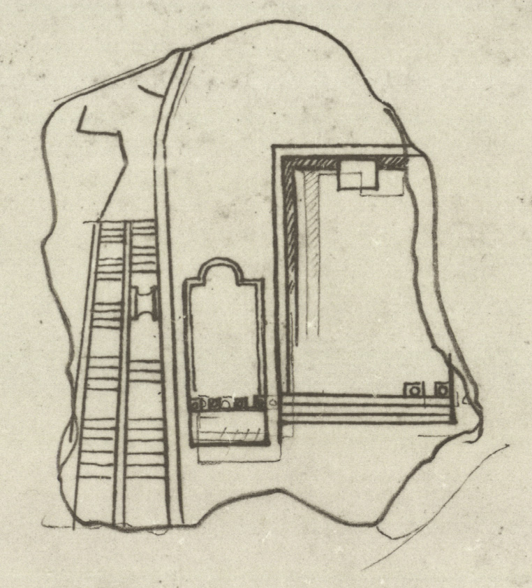 | Description Renaissance drawing Cod. Vat. Lat. 3439 - Fo 20r shows that the lost fragment b depicted part of a large temple (see detailed photo above or PM 1960, pl. 10, no. 7). The drawing seems incomplete: While the rectangular podium with a wide staircase in front is complete, only parts of the cella and the surrounding or frontal colonnade are included. The cella walls are rendered with recessed double lines, as is common on the Marble Plan. A small altar is placed along the rear wall of the cella. This part of the drawing was apparently corrected - an earlier pencil sketch is still visible below the inked lines. Two columns, rendered as dotted squares, are placed in the corner of the platform, along the frontal steps.