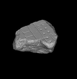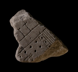 | Description The bottom half of the fragment depicts a corner of a podium temple. The cella is rendered with recessed double lines, as is common on the Plan. It is surrounded by one row of columns and has two columns in antis, all rendered with single dots. A row of dotted squares in front suggests that the temple was faced with a row of six(?) columns on plinths. The frontal staircase had at least five steps. A row of rooms or tabernae backs on to the temple and is separated from it by a narrow passageway.