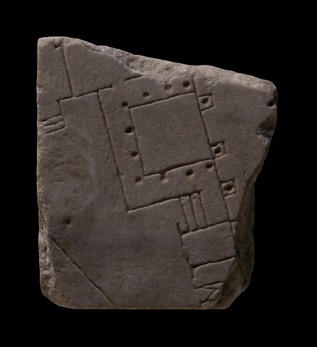 display a similar mark (generally on the bottom edge of the slab?). Along the right side of the fragment is depicted part of a covered portico whose inner colonnade is rendered with dots while the outer is shown with dotted squares. This suggests that the former consisted of plain, free-standing columns, while the outer columns were engaged and stood on plinths. The rest of the incisions articulate a different group of structures. At center, abutting the back wall of the large portico described above, lies a small peristyle. Wide steps lead to it from an open space at left and suggest that it stands on a podium. Along the upper edge of the small peristyle, an opening leads from it into another space. At the fragment's top left, a set of three steps leads from the same open space below the peristyle up into an adjacent space. At bottom right, next to the steps that lead to the peristyle, two small rooms or tabernae and an interior staircase open onto the open space at left and abut the back wall of the portico at right. A straight line traverses the lower left corner of the fragment in an oblique angle to the large portico.