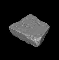 | Description This fragment formed the corner of a slab. On the bottom edge, a rectangular area has been chiseled away to accomodate the clamp from the adjoining slab. Only frs. 1abcde,