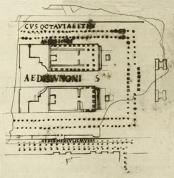 Identification: Aedis Iovis Statoris The temple visible in this missing fragment is identified by an inscription in fr. 31u as the Temple to Iuppiter Stator, constructed by Q. Caecilius Metellus Macedonius after his triumph in 146 BCE, probably in 131 BCE, when he was censor. The building was also referred to as the aedes Metelli and the aedes Iovis Metellina (LTUR III, p. 157). Nothing remains of the temple today. According to Vitruvius (3.2.5), it was peripteral, hexastyle and had eleven columns on each side including the corner columns (LTUR III, 157; Richardson 1992, pp. 225-226); FUR frs. 31z and u, however, depicts it as peripteral sine postico, hexastyle, with nine or ten columns on the flanks. The difference has been attributed to possible later reconstructions, especially the one that must have taken place in the Augustan period when the curia or schola Octaviae was constructed behind the temple (LTUR III, p. 158; Richardson 1992, p. 226). As is common on the Plan, the walls of the cella were rendered with a double line (see reconstruction in PM 1960, pl. 29). The columns that surrounded the cella were depicted as dotted squares, suggesting that they stood on plinths. The temple was approaced from the front by a wide staircase, in front of which stood an altar, and a small enclosure for the cult statue abutted the back wall of the cella. As emphasized by ancient authors, the temple to Iuppiter Stator stood next to the temple of Iuno Regina (see below) within the porticus Metelli, a structure that was rebuilt and renamed the porticus Octaviae (see below) in the Augustan period (LTUR III, p. 157).