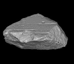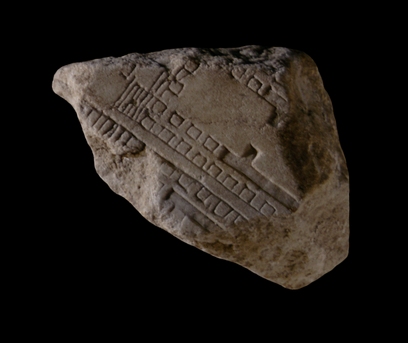 | Description The fragment depicts part of two podium temples side by side. Of the less well-preserved temple, bottom left, part of the pronaos, which is three columns deep, a corner of the cella, seven of the lateral columns, and at least six steps of the frontal staircase are visible. The pronaos of the better-preserved temple (top right) is four columns deep. The temple was hexastyle and had at least eight columns along the sides. There is a platform(?) at the center of the frontal staircase and an altar in front. The columns of both temples are rendered with squares and the walls of the cellae with recessed double lines--a technique employed for most temples on the Marble Plan.