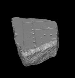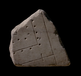 | Description This fragment was part of the lower edge of the slab. It depicts the corner of a double portico. A line separates the inner from the outer colonnade. The corner of a linear feature within the porticoes is just visible at the upper left corner. The vertical outer wall of the double portico continues down past the corner of the building. A short line across the horizontal outer wall perhaps marks an opening from the outer portico into a neighboring building.