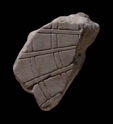 Identification: Theatrum Marcelli The curved seating area depicted in this fragment is from the cavea of the Theater of Marcellus (PM 1960, pp. 91-92; AG 1980, p. 114). This stone theater, Rome's second, was begun by Julius Caesar who razed several sacred structures to make room for it. The building was finished by Augustus who named it in honor of his sister Octavia's son, Marcellus, and it was inaugurated in 13 or 11 BCE. (LTUR V, pp. 31-32). Part of the cavea of the theater is still standing, thanks to its conversion at an early stage into a fortress, then a castle, and finally a private residence for the Orsini family in 17th century. In the 1930's it was expropriated; shops were removed from its bottom arcade and abutting houses were torn down (LTUR V, p. 32). Excavations within the theater, Renaissance drawings, and the standing remains themselves demonstrate that the cavea consisted of three layers; within each layer a complex system of radial corridors and staircases intersecting with annular walkways brought the spectators to and from their seats. Each layer was distinguished architecturally on the exterior of the cavea: the bottom arcade was open and had pilasters of the Doric order interspersed between the arches; the middle arcade was also open and it was decorated in the Ionic order; the top section probably consisted of blind arches, embellished with pilasters of the Corinthian order (LTUR V, p. 33; Richardson 1992, p. 383). The Marble Plan generally depicts the ground plan of buildings; in the case of the entertainment buildings, however, the engravers of the Plan diverged from the rule and showed entire or parts of buildings as seen from above (see for example the fragments of the Colosseum, the Circus Maximus, and the Theater of Pompey). Also the cavea of the Theater of Marcellus seems to be rendered partially from above. In other entertainment buildings, the concentric lines designate the praecinctiones that divide the seating area according to rank. In the case of the Theater of Marcellus, however, there are too many lines to denote praecinctiones. There is also a clear distinction between the rendering of the concentric lines in the outer and the inner half. Perhaps the engravers here used double lines to show the three praecinctiones in the outer half, and the single lines to convey the idea of rows of benches in the inner half (Reynolds 1996, p. 87). The radials in this fragment do not represent the walls of the substructure but the stairs that divided the cavea into cunei (PM 1960, p. 91). Other parts of the cavea of the Theater of Marcellus are visible in frs. 31eno, 31qrs, and 31il.