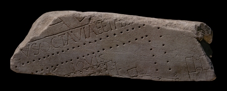 In the courtyard of the porticus Octaviae two temples stood side by side, one dedicated to Iuppiter Stator and one to Iuno Regina. The temple that is partially visible in this fragment is identified by the inscription above it as the aedis Iovis (PM 1960, p. 91, pl. 29; AG 1980, p. 114, pl. 23). The rest of the inscription and of the temple is visible in fr. 31vaa and the missing 31ggz. The temple to Iuppiter Stator was constructed by Q. Caecilius Metellus Macedonius after his triumph in 146 BCE, probably in 131 BCE, when he was censor. The building was also referred to as the aedes Metelli and the aedes Iovis Metellina (LTUR III, p. 157). Nothing remains of the temple today. According to Vitruvius (3.2.5), it was peripteral, hexastyle and had eleven columns on each side including the corner columns (LTUR III, 157; Richardson 1992, pp. 225-226); the Marble Plan, however, depicts it as peripteral sine postico, hexastyle, with nine or ten columns on the flanks. The difference has been attributed to possible later reconstructions, especially the one that must have taken place in the Augustan period when the curia or schola Octaviae was constructed behind the two temples (see frs. 31vaa and 31bb; LTUR III, p. 158; Richardson 1992, p. 226). As is common on the Plan, the walls of the cella are rendered with a double line (see reconstruction in PM 1960, pl. 29). The columns that surround the cella are depicted as dotted squares, suggesting they stood on plinths. The temple was approaced from the southwest by a wide, frontal staircase, whose individual steps are not shown on the Plan. In front stood an altar, and a small enclosure for the cult statue abutted the back wall of the cella.