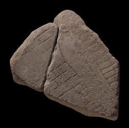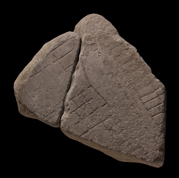 | Description These joined fragments were part of a slab edge. The surface of the fragments is extremely corroded and worn, making it difficult to discern whether the long, uneven line that traverses the entire group on an oblique angle is deliberate or not. The line has been included in AG 1980, pl. 46, which makes it seem legitimate despite its obvious incongruence with the remaining, rectilinear architecture. On the right, a wide street is flanked by a row of tabernae, fronted by an arcade. Additional rooms at the back indicates these were back-to-back tabernae. Bottom left, a corner of a building is visible. On the right it is flanked by a row of rooms that open onto the street as well as onto a courtyard behind them. A wall separates them from another row of back-to-back tabernae on the left. The shops that face left are smaller than those on the right. The uneven line creates a border between these shops and the arcaded street to the right that continues to the top of the fragment group. Far left lies another row of shops, facing the back-to-back shops across a wide street.