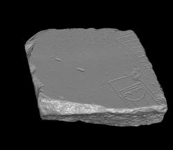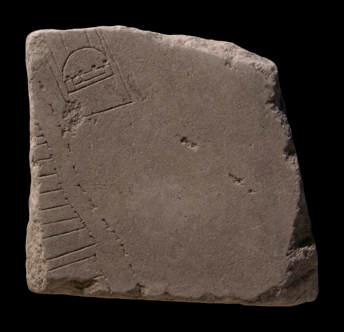 | Description The fragment was part of a slab edge. It depicts a large blank area to the right which is flanked on the left by an uneven row of tabernae fronts, faced with an arcade or covered colonnade. In the blank area at top, right next to the arcade, the end of an unusual structure is visible. It consists of a platform on top of which sits the actual building. Two wide steps, flanked by perpendicular edges or narrow platforms, lead to the front of the building. Immediately above the steps an arch, perhaps a barrel vault, stretches across the width of the structure. Four columns are spaced regularly along the flat end of this arch. Two elongated lines, parallel to the sides of the building, emerge from the curve of the arch.
