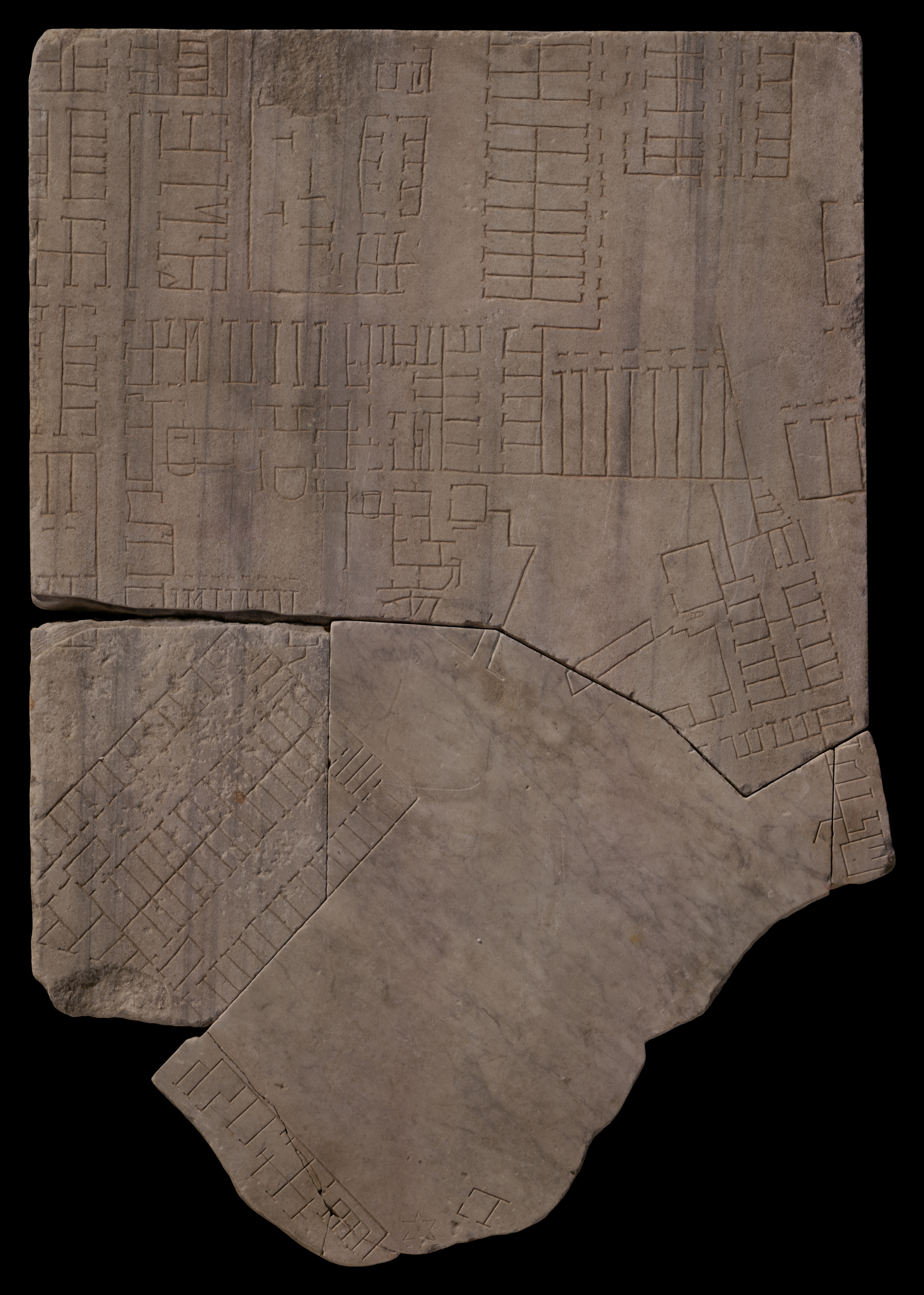 Identification: Naumachia Transtiberina The great open space covering frs. 28b, 28c, 33abc and 34c was identified in 1942 as the Naumachia Transtiberina of Augustus. This was not accepted by PM 1960. Coarelli has argued more recently that other proposed locations for this Naumachia simply aren't extensive enough, while here are both sufficient space and the arrival of the Aqua Alsietina, built for the Naumachia. Indeed, the deviation of the Via Campana here and farther to the south may be linked to the construction of the Naumachia, which needed all available space. The Naumachia's northern edge is clearly visible at the middle right edge of group 33, giving a total length of ca. 540m, a good correspondence to the 533m reported in the Res Gestae 12.23. To the north, visible on this fragment, a warehouse intrudes into the area of the Naumachia and should therefore postdate it, meaning that the Plan offers precious evidence of the state of the Naumachia in the Severan period.