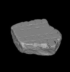 fig. 8). Manual observation of the three-dimensional computer models of the fragments allowed to infer that the fragments lie immediately adjacent to one another, based on the strongly corresponding shape between the fractured edges along the proposed interface (fig. 9). Further evidence of the match is evident in the spacing of the rooms, dashed line, and row of T-shaped piers that traverse the two fragments, including the recurrence of stairways in every third room along the right side of the central street.