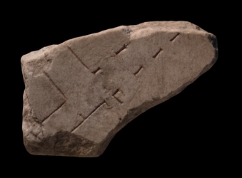 | Description The fragment is part of two slab edges near a corner. It seemingly depicts parts of three buildings. Two joining walls of a building are visible in the lower left part of the fragment. This structure is separate from another at top of the fragment, which seems to consist of a wall that joins with an arcade. A possible thoroughfare separates these two buildings from a structure in the lower right whose outer wall consists partially of a solid wall, partially of an arcade. Where the wall meets the arcade, both turn a corner. This either marks an entrance to the building, or it signifies that there are in reality two structures, separated by a narrow passageway.