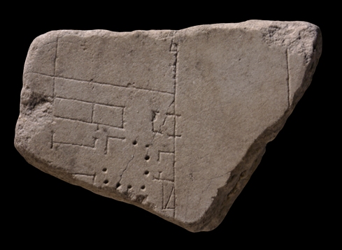 | Description To the right and at top, the fragment depicts two large, rectangular enclosures that must be open to the sky. They flank a section of a large building in the bottom left corner. The building contains a square peristyle around which are situated variously sized and shaped rooms.
