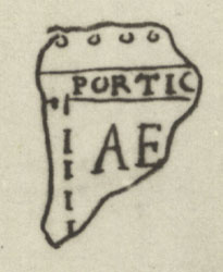| Description The fragment is now lost, but Renaissance drawing Cod. Vat. Lat. 3439 - Fo 22r shows what it depicted (see detailed photo above or PM 1960, pl. 13, no. 8). Two parallel lines crossed the fragment at a diagonal angle from center left to upper right. Between them, the letters PORTIC were inscribed and above them ran a colonnade with four visible columns. To the left and below the letter P there was an opening in the bottom line. It seemed to give access to a room that was flanked on the right by an arcade or colonnade. The letters AE appeared in the space to the right of this colonnade.