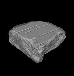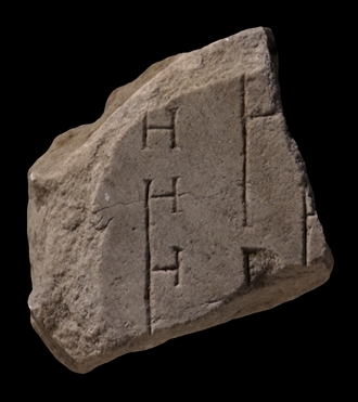 | Description A vertical wall with one opening traverses the fragment on the left. It is lined on the right by short, T-shaped piers. On the right are two more vertical lines, parallel to the first. The middle line also has a small opening and it seems to be connected to the rightmost wall through a short, perpendicular wall at the top. Another perpendicular wall seems to emerge on the right side of the rightmost vertical wall.