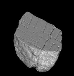 Identification The authors of PM 1960 joined this fragment with fr. 378 during the printing of this volume and included a drawing of the joined fragments on p. 137. Rows of tabernae are ubiquitous on the Plan, and the type depicted here are of the most common type seen on the FUR. Each shop consisted of a single room with a wide opening towards the street that could be screened off a night. The owners may have resided with their families on a wooden platform in the back of the shop. The shops lined the bottom of multi-storey buildings in this case. This asymmetrical conglomeration of shop architecture is similar to that depicted in fr. 165abd. The skewing was probably caused when the Roman map makers mosaicked together the surveys of different sections of the city.