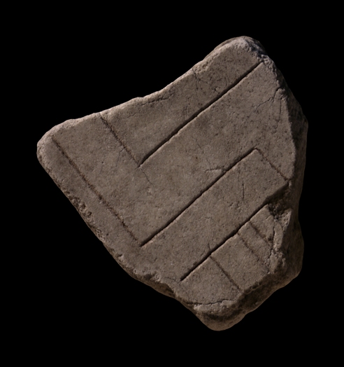 | Description From left, two parallel lines traverse the fragment, making first a sharp left, then a sharp right turn. Bottom right, parallel and perpendicular lines join these lines.
