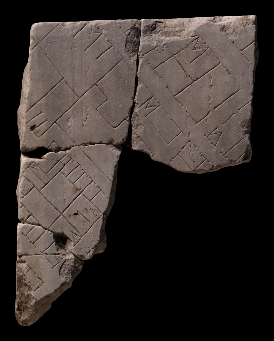 by the boundary incision matching process done at Stanford (Koller-Levoy 2005, 7-8, fig. 19). Four sets of incised features aligned well across the horizontal slab boundary between the two candidates; three of them lie along the sides of the parallel streets, and the fourth appears as a half-eroded incision on the lower-left corner of fr. 576,perpendicular to the street features and aligning with the incision in the upper-left of fr. 37Ai. Though this proposed match is far from certain, other similarities between the two fragments deserve its consideration. The style of the incisions on fr. 576 is very much like that of fr. 37A, and the depiction of the architecture, such as the stairways, is similar.