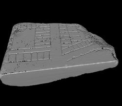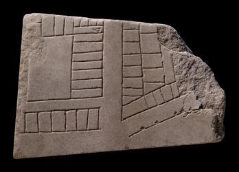 | Description The fragment formed part of the corner of a slab. One clamp hole is visible along top edge. The straight bottom edge is a modern cut (see history of fragment). A vertical street divides the architecture into two sections. Top left, a large courtyard is surrounded along the right and top edges by rows of tabernae. Although no openings are shown, the individual shops would have had access to the street (or to the courtyard). A staircase at top center may indicate that these rooms were above ground level and were entered from below, hence the lack of openings. Below lies a single row of tabernae, parallel to the courtyard building above. These shops also do not have any visible openings. In the right side of the fragment, the lower left corner of a trapezoidal or triangular building is visible. It is flanked on the left and along the bottom by non-accessible tabernae. An inner row of shops or rooms, facing inwards, lines the left side. Parallel to the bottom row of tabernae on the right runs a straight line with small circles added at regular intervals.