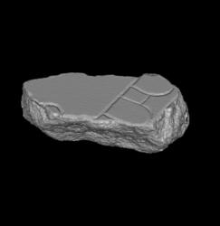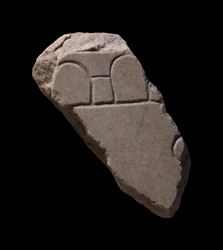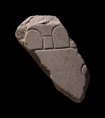 Top of fragment has two half-ovals with dash connecting them, probably representing the arches of an aqueduct. The lower part of the fragment has no features except for a circular incision on the right edge.