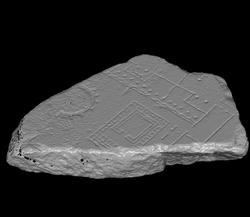 | Description This fragment is part of the edge of a slab. The top part of the piece is devoted to an open space in which there are two temples, a circular temple surrounded by columns, and a rectangular, peripteral podium temple, fronted by a wide staircase. The walls of the cella in both temples are incised in outline (traces of red paint are still visible in the tholos temple), and the columns in the podium temple are drawn as squares, as is common for temple architecture on the Plan. A dashed line next to the podium temple represents an arcade or colonnade that delineated the open space on one side. A passageway in the lower left corner leads from this open space to a porticus in the lower right corner of the fragment. The area between the back wall of the porticus and the back wall of the open temple space is occupied by a row of dots and a wavy line, both parallel to these walls. This space is interrupted by two rectangular, distyle exedrae in the back wall of the porticus. A semi-circular line within the second niche suggests it was arched. The roof line of the porticus is barely visible along the breaking line in the lower right corner of the piece.