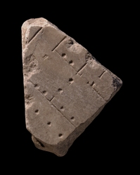 | Description The left side of the fragment was part of a slab edge; a clamp hole is still visible on the edge. The architecture depicts the end of a covered portico with a secondary colonnade running parallel to it on the left. The top section of the covered portico has been partitioned off and made into an entry hall by the addition of two sets of antae and columns. The hall leads from the portico into a perpendicular street or alley. A small exedra or room with two columns on the left abuts the entry hall on the right. Below the entry hall, a door on the right leads from the portico into interior rooms.