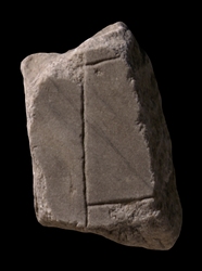 | Description A straight, vertical line traverses the fragment. Two parallel lines join it from the right at a perpendicular angle. The veining of this fragment stands out clearly.