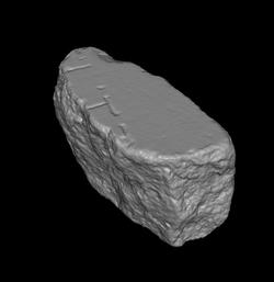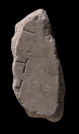 | Description The small fragment was part of a slab edge. It depicts a short stretch of a street. On the bottom left, the street is flanked by what seems to be small rooms, and above them, two or three short dashes which may represent columns or pillars between a wall.