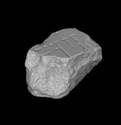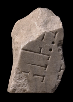 | Description The fragment was part of a slab edge. It depicts a narrow street or alley which separates a building on the left from a series of rooms (?) on the right. The building on the left consists on the bottom of a large room with at least three openings to the street and to an area below it. It is divided by a wall from rooms at top. Here, what seems to be a colonnaded entrance (two columns are visible) gives access to a larger room at top left.