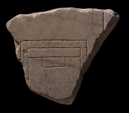 | Description The fragment depicts the rear of a podium temple. Square columns surround the cella, suggesting that the temple was peripteral. The individual columns are aligned along the outer edge of the podium. In the back of the cella an elongated podium or base spans the width of the building. It is fronted by another podium or perhaps a step. Top right, a vertical line runs parallel to the right side of the temple.