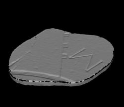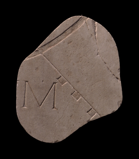 | Description The edges of the piece were rounded and the back sawn off in 1742 when it was inserted into wooden frames for exhibition, hence its overly smooth and rounded appearance. The fragment shows the outer section of a circular or semi-circular feature, rendered with a recessed double line. Three small recessed squares, probably columns, abut a straight wall or edge that extends from the curved structure. A large "M" appears to the left of this wall.