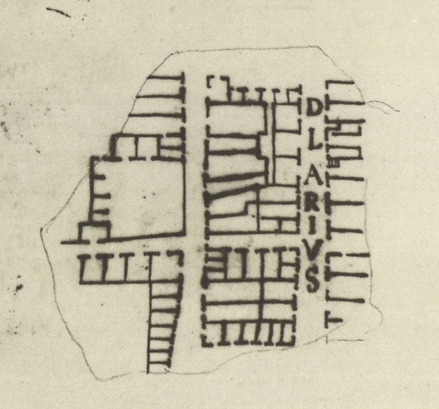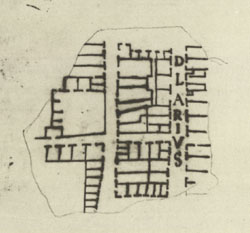 | Renaissance drawing: Section of a city block (insula) in the SW area of the Field of Mars (campus Martius), possibly including the headquarters (schola) for a collegium?