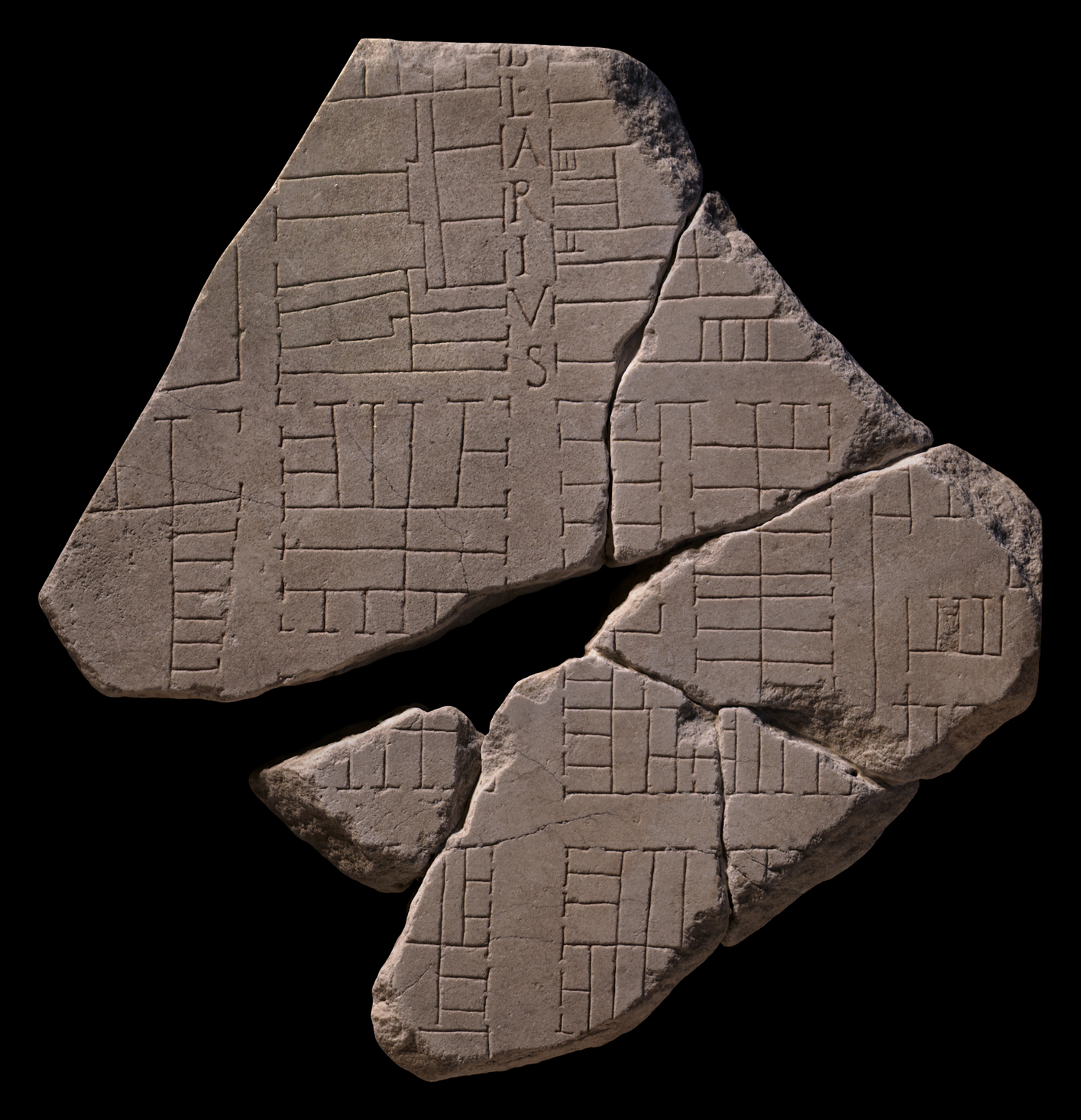 | Description The six fragments, now joined, were part of the upper right corner of a slab, with parts of the upper and the right edge still preserved. A vertical street, partially labeled [...]BLARIUS, traverses the group in the center and divides the depicted architecture into two halves. It is paralleled by two narrower, equidistant streets on either side and crossed by two perpendicular streets. The architecture is thus laid on a perfect grid. Most of the nine depicted city blocks (some are only partially visible) consist of single rooms of varying sizes that each have one entrance facing one of the streets mentioned. The blocks or insulae in the upper right corner and the far right fragment stand out by being multi-storeyed. The large block on the center right is unusual in that a vertical corridor onto which several of the rooms open is situated in the center of this particular . Apart from being a multi-storeyed building, the block on the far right also differs from the others in that a wall seems to surround the individual rooms, thus restricting access to them. Was this a hotel? Finally, the block on the far left has, unlike the others, a large central courtyard which is framed by the outward-facing rooms or shops.