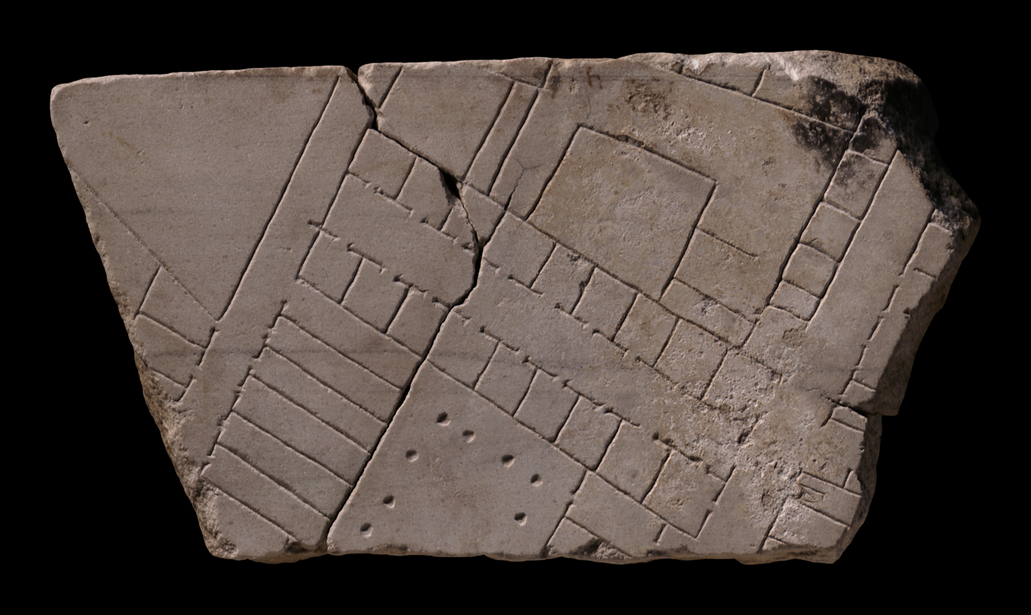 Two parallel streets run diagonal top right to bottom left on the left and right side of the fragments. The cluster on the left corner has a large open area on the top and three rooms flanking the street below. This cluster possibly continues into fragment 421c. The middle of the fragments has three different structures located between the two streets. The top structure has several large rectangular spaces, a row of small rooms (no openings) on the right side and a row of larger rooms on the top. The structure in the middle consists of two rows of rooms opening up to a middle corridor. The lower structure has a row of long and narrow rooms opening up to the street on the left. Behind these is an open space with a colonnade on the three visible sides. Two rooms are located to the right of this open space.
