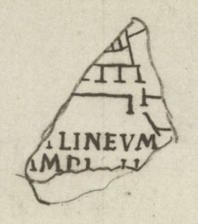 | Description The fragment is missing but Renaissance drawing Cod. Vat. Lat. 3439 - Fo 19r shows what it depicted (see detailed photo above or PM 1960, pl. 9, no. 6). At top, a horizontal row of rooms facing downwards crossed the fragment from left to right and stopped short of the right edge. The rooms backed onto a narrow corridor with smaller rooms at top. The horizontal row of rooms was separated from a structure in the bottom half of the fragment by a narrow passageway. A narrow opening gave access from this passageway to the building at the bottom which consisted of a large, open space to the left and a vertical row of rooms on the right that opened onto the open space. The letters A*LINEUM/AMPE*L*I* were inscribed in this open space.