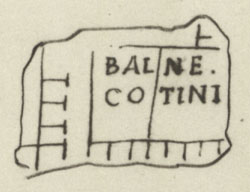 Identification: Balneum Cotini The inscription conveniently identifies the rectangular structure as part of a bath complex, the balneum Cotini. This bath is not known from any other source (PM 1960, p. 114). Its irregular layout is characteristic of smaller neighborhood baths (Staccioli 1961, p. 93). E. Rodríguez-Almeida has suggested that the vertical line in the rectangular space perhaps separated the bath into women's and men's sections (LTUR I, p. 159).