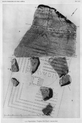 | Description The upper part shows a very different kind of topography from the lower. A street emerges from a large open space at upper right; it continues toward the center of the fragment between walled open spaces of irregular shapes. At the center of the fragment, this street opens into yet another large, irregularly shaped, open space. At the left side of this central piazza, two streets depart. One moves straight upward to the top of the fragment; on the adjoining fr. 4a, this street continues alongside an aqueduct, the arcus Neroniani. The second street continues in a zigzag pattern toward the left edge of the fragment and becomes a staircase or ramp at lower left before continuing off the fragment. At center, occupying much of the central piazza, is a curious feature shaped like a large, upside-down V. At upper left, above the zigzag street, is a complex that includes three rectangular courtyards of different shapes and sizes, each surrounded by smaller rooms. Since this complex lies parallel to the massive temple platform (see below), it may have been built at the same time as the platform, or later. Across the zigzag street and just below the central piazza, a series of structures is situated along the long boundary wall running left to right across the fragment and dividing the upper portion from the lower. These structures include a large room with a wide apse in the top wall; the doorway into this room is opposite the apse. At the center of this apse is a roughly rectangular shape that was carved recessed and originally filled with red paint, perhaps representing a statue base. On the right and left sides of this apsidal building stand smaller, rectangular rooms, each with an arcaded bottom wall with three entranceways, and two short piers or walls (or statue bases in the case of the room on the right?) jutting into the room from the top wall. The righthand room is surrounded by additional walls; a staircase is symbolized by the small V shape just above it. This staircase has four transverse bars; if Pedroni 1992 is correct, this may indicate four upper stories to the building at this point. The apsidal building and its two flanking buildings all open onto a long passageway running left to right across the fragment, just above the boundary wall that divides the lower part of the fragment from these features in the upper half. To the right of this trio of buildings is a long rectangular building; inside, a wavy line runs along two sides. This may be a latrine (compare the latrine in fr. 37a, behind the Portico of Pompey). It opens onto an offshoot of the large open space at the right side of the fragment.
